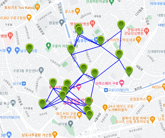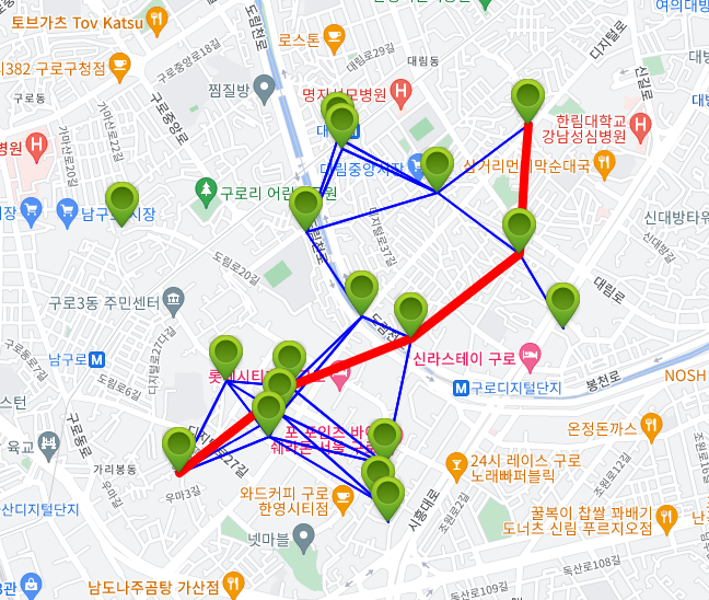 최단거리는 약 1.85km이고 환일종합식품 -> 코오롱제약 -> 맥스엔영 -> 해태정육점 -> GS25 대림한신점으로 가는 경로가 가장 최단 경로임을 확인할 수 있다.